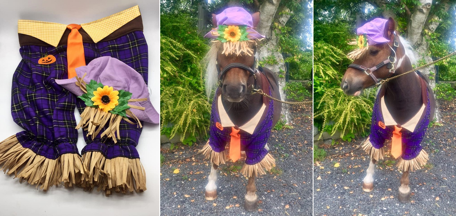 Purple check trousers/yellow check collar/orange tie on purple neckband (trousers have Velcro to fasten around legs), straw effect rafia and embroidered pumpkin logo.