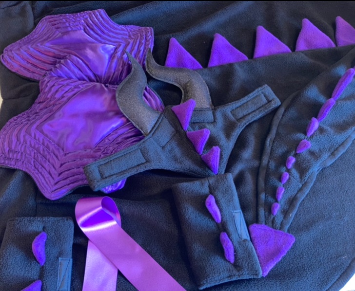Caparison with wings (similar style to our dragon outfit) + browband with sparkley horns, all in black and purple