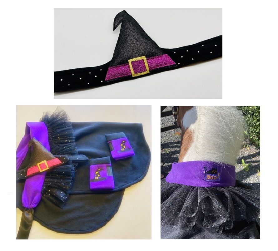 2-piece outfit comprising glittery Witch's hat browband with twinkling crystals and black & purple cape with sparkley frill and emboroidered Black Cat logo