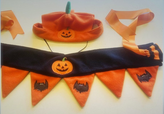 Hat - with Velcro and elastic attachments - and frilly, sparkley tutu (can be used as neckband if preferred), all with embroidered pumpkin logos.